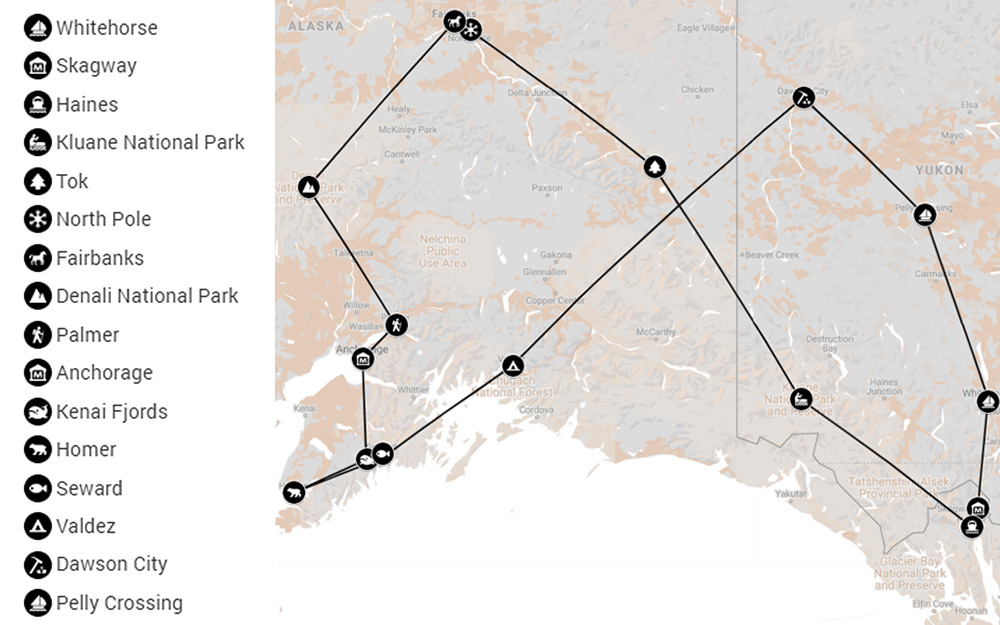 Je vliegt op Whitehorse in Yukon, waar je de camper ophaalt. In Whitehorse pak je de Klondike Highway naar Skagway. Vervolgens neem je de ferry naar de andere kant van de Chilkoot Inlet. Via Lutak Road bereik je Haines. Daar neem je de State Highway 7 en Haines Highway naar Haines Junction. Vanuit Haines Junction rijd je via de Yukon 1 en Alaska Highway 2 naar North Pole. Vanuit North Pole brengt de Alaska Highway 2 je naar Fairbanks. Daar houd je links aan en ga je Alaska Highway 3 op naar Denali National Park. De Alaska Highway 3 richting het zuiden brengt je ook naar Palmer. In Palmer neem je de Alaska Highway 1 richtingen het zuiden naar Anchorage. Dezelfde weg brengt je ook naar Kenai en Homer. Vervolgens neem je Alaska Highway 1 terug richting het noorden. Na 132 mijl houd je rechts aan en ga je de State Highway 9 op naar Seward. In Seward ga je weer de State Highway 9 die, als je rechts aanhoudt, overgaat in de Alaska Highway 1 tot aan Whittier. Hier neem je de ferry naar Valdez. Een lange rit via de Alaska Highway 4 en Alaska Highway 1 brengt je naar Tok. Vervolgens bereik je Dawson City via de Tailor Highway 5 en de Top of the World Highway. Let op: deze wegen zijn in de winter gesloten. Rijd je deze route in de winter, dan moet je een enorme omweg nemen via de Yukon 1 en de Klondike Highway. Vanuit Dawson City neem je de YT-2 richting het zuiden en rijd je via Pelly Crossing naar Whitehorse, waar je de camper weer inlevert.