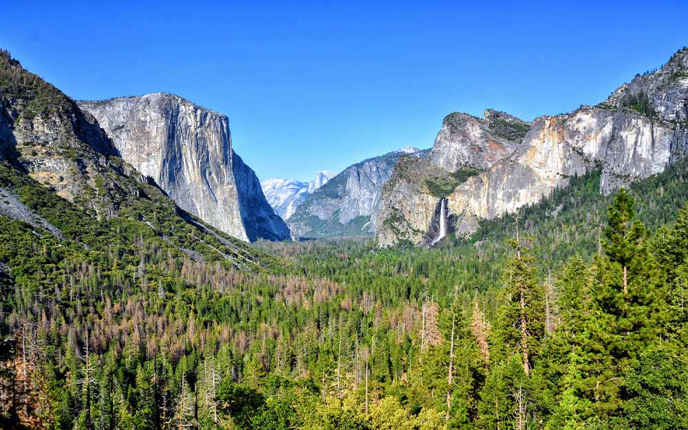 We zetten onze huurauto (zo’n patserige pick-up) neer bij de parkeerplaats van het drukke uitkijkpunt van Tunnel View. Daar start de Pohono Trail. Een onwijs steil pad met een hoop haarspeldbochten. Toen we aankwamen bij een kruising, sloegen we linksaf. Ik denk dat we nog een kilometer hebben gelopen voordat Artist Point in zicht kwam (na 45 minuten in totaal). Er waren geen borden waar we het aan herkenden, maar we wisten het direct. Een onwerkelijk uitzicht ontvouwde zich voor ons, vergelijkbaar met Tunnel View. De Half Dome, Clouds Rest, Bridalveil Meadow, Royal Arches, Ribbon Fall: werkelijk alles konden we zien vanaf dit uitkijkpunt. Behalve een ander mens.