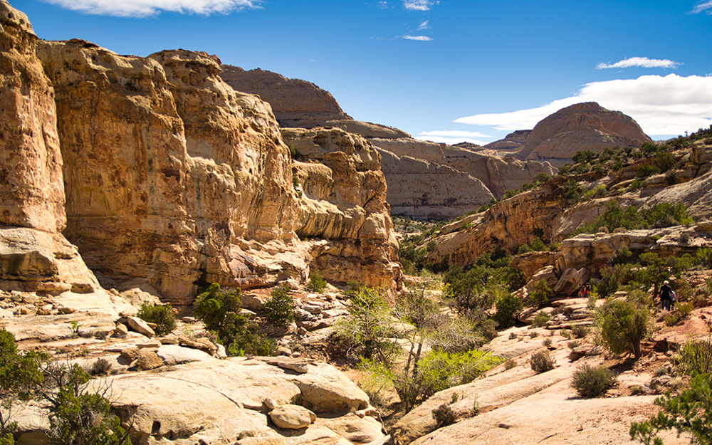 Langs de kletterende Fremont-rivier ligt het Fruita Campground. De mosgroene boomgaarden die het kamp overdekken steken prachtig af tegen de omringende rode rotsen. Een oase, middenin de woestijn van het Capitol Reef National Park.