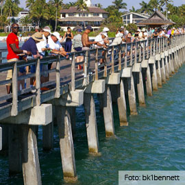 Vissers kunnen hun geluk niet op, zij slaan vierentwintig uur per dag geheel gratis hun hengel uit op de Naples Pier. Deze historische, 304 meter lange pier dateert uit 1888 en dient nu vooral als vissersplek, maar ook als hotspot voor het zien van panoramische uitzichten. Vooral met zonsondergang heb je hier een scenisch uitzicht over het water.